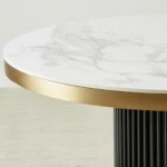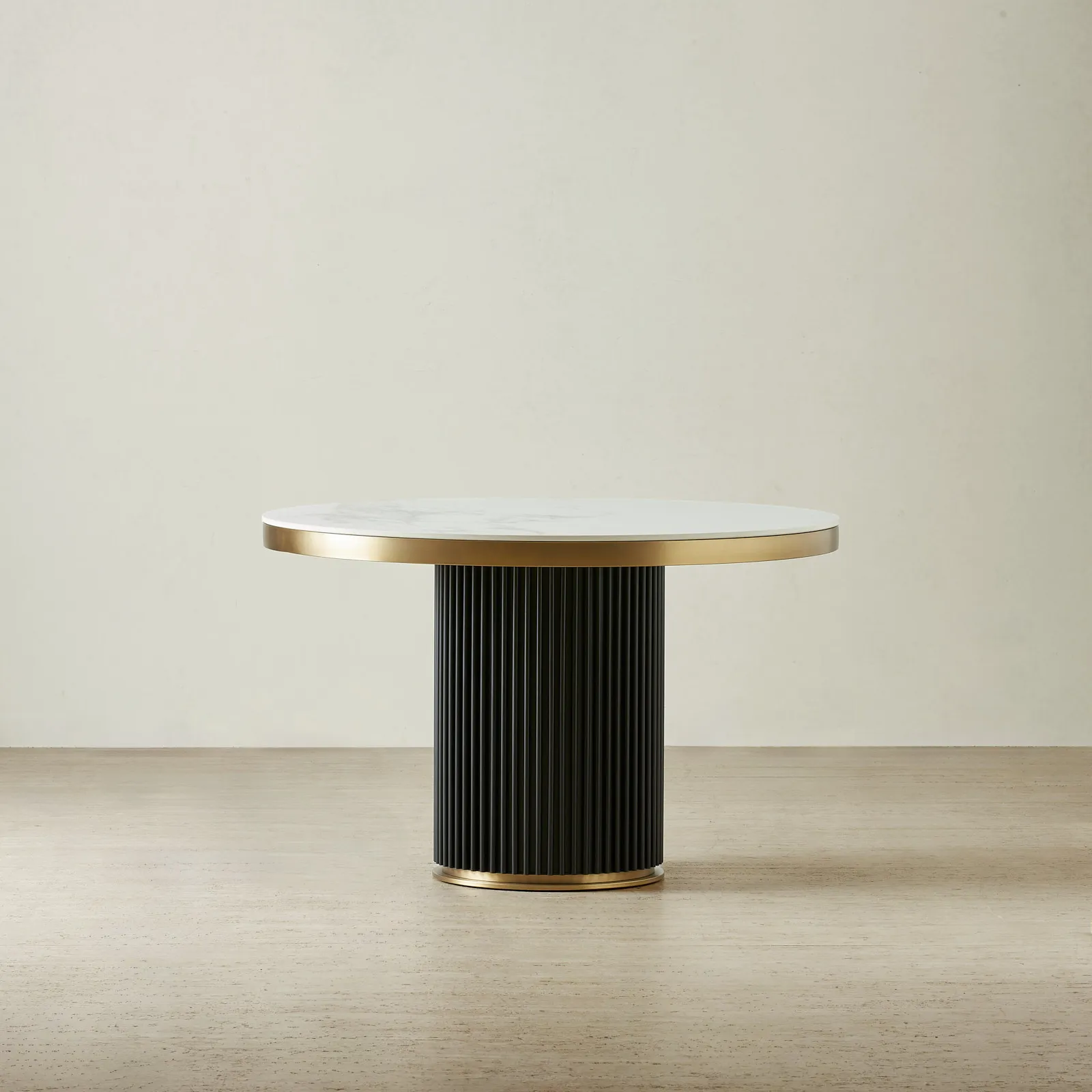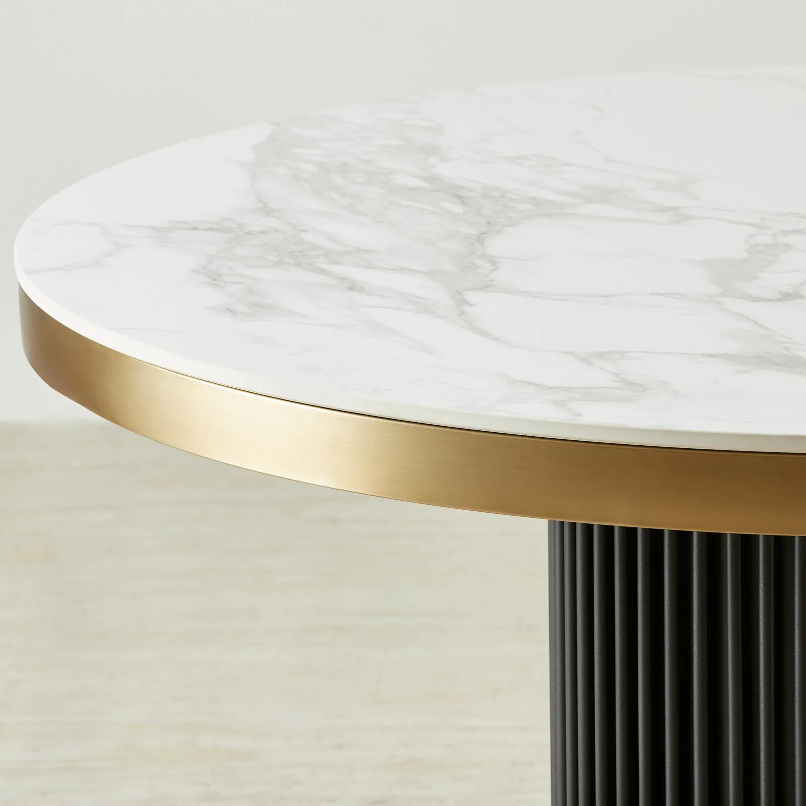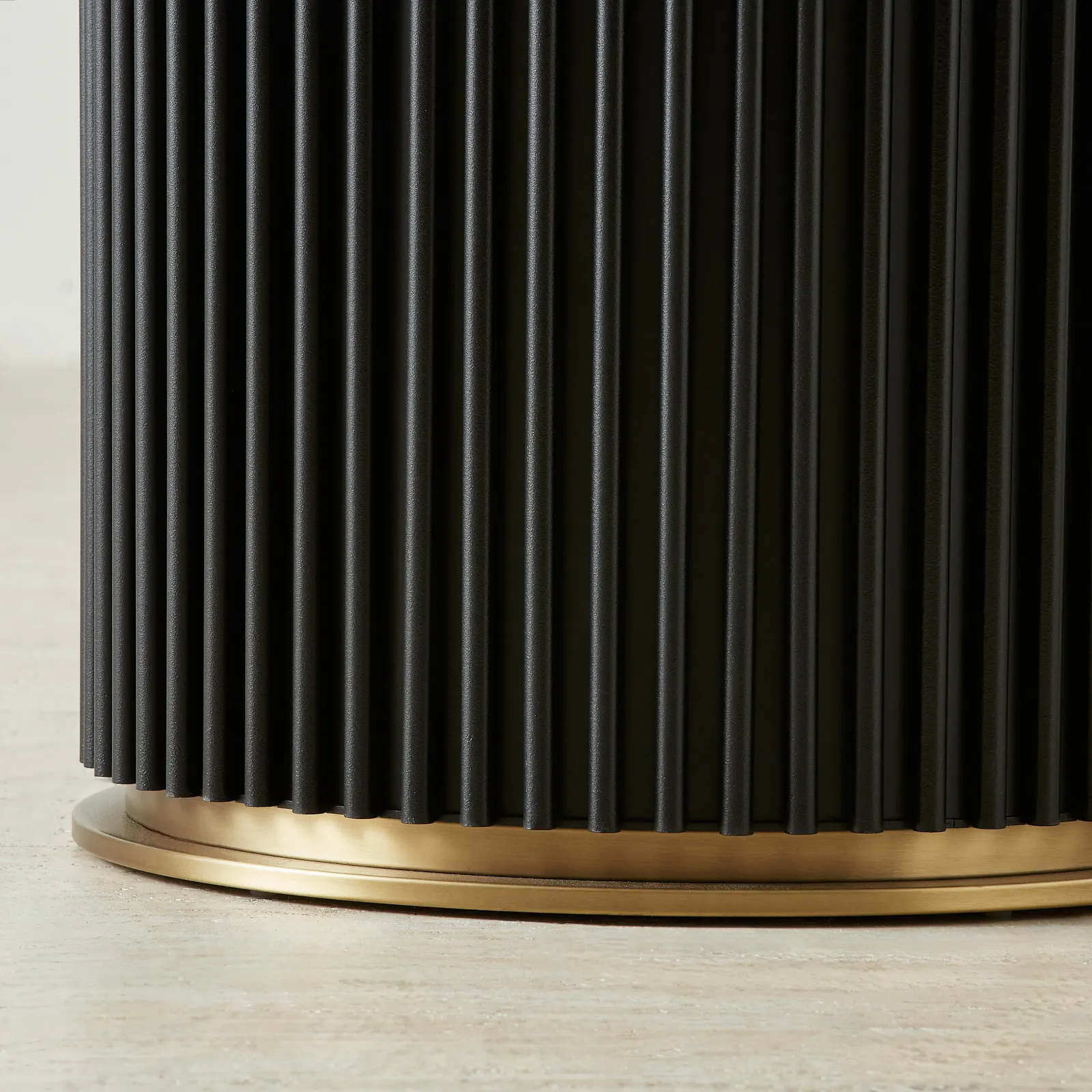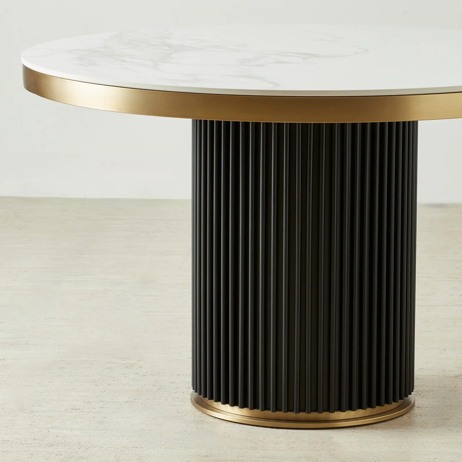 A fluted matte black pedestal base brings architectural depth while maximising legroom. Brushed brass accents frame the top and base, adding a polished contrast to the monochrome palette.