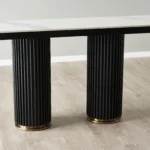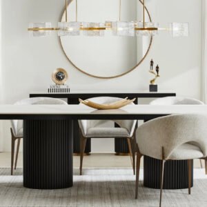 In the world of modern design, Koala Living introduces the Archie Collection, a manifestation of Emily’s innovative vision. Inspired by her global adventures and experiences at the renowned Salone del Mobile Milano fair, Emily was captivated by column sculptures, inspiring her to reimagine them in the realm of furniture. Thus, the Archie Collection was born—a seamless blend of contemporary style and practicality. At its core, Archie showcases sculptural iron legs cradling a sintered stone tabletop. The stone’s captivating hues reflect the natural beauty of earth’s own minerals, each piece a tribute to timeless elegance. This collection comprises two variations of round coffee tables, two dining table options in various sizes, a side table, and a bar table. The dining tables offer two distinct color schemes: a serene white with subtle grey veins for a monochromatic allure, and a lavish black adorned with brushed gold and bronze veins for a more opulent feel. The Archie Collection epitomizes the pinnacle of contemporary furniture craftsmanship.