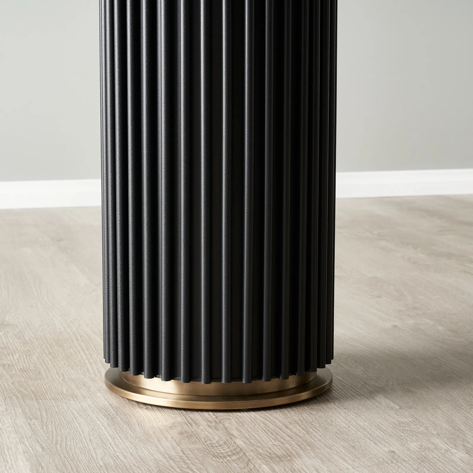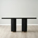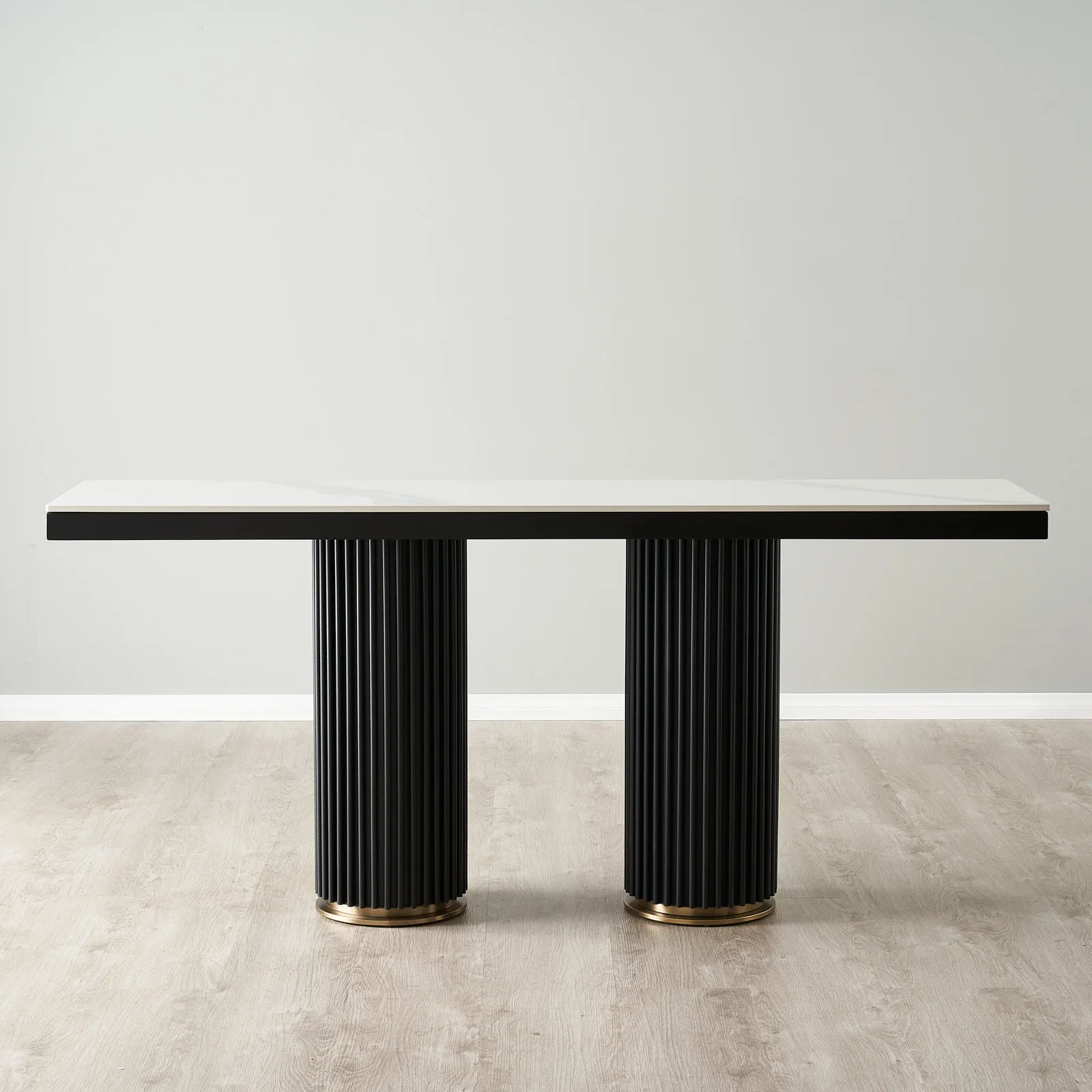 The Archie White Sintered Stone Console Table marries durability with high design, featuring a resilient white sintered stone top. This pristine surface is supported by stark black powder-coated iron column legs, grounded with elegant steel rings in a rich golden finish at the base, providing a contrasting note of opulence. It’s a piece that not only stands up to daily use but also stands out as a sleek accent in any space.