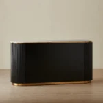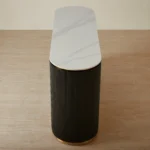 The Archie Sideboard marries durability with high design, featuring a resilient white sintered stone top. This pristine surface is supported by sleek black stainless-steel panels, grounded with a luxe golden base.