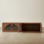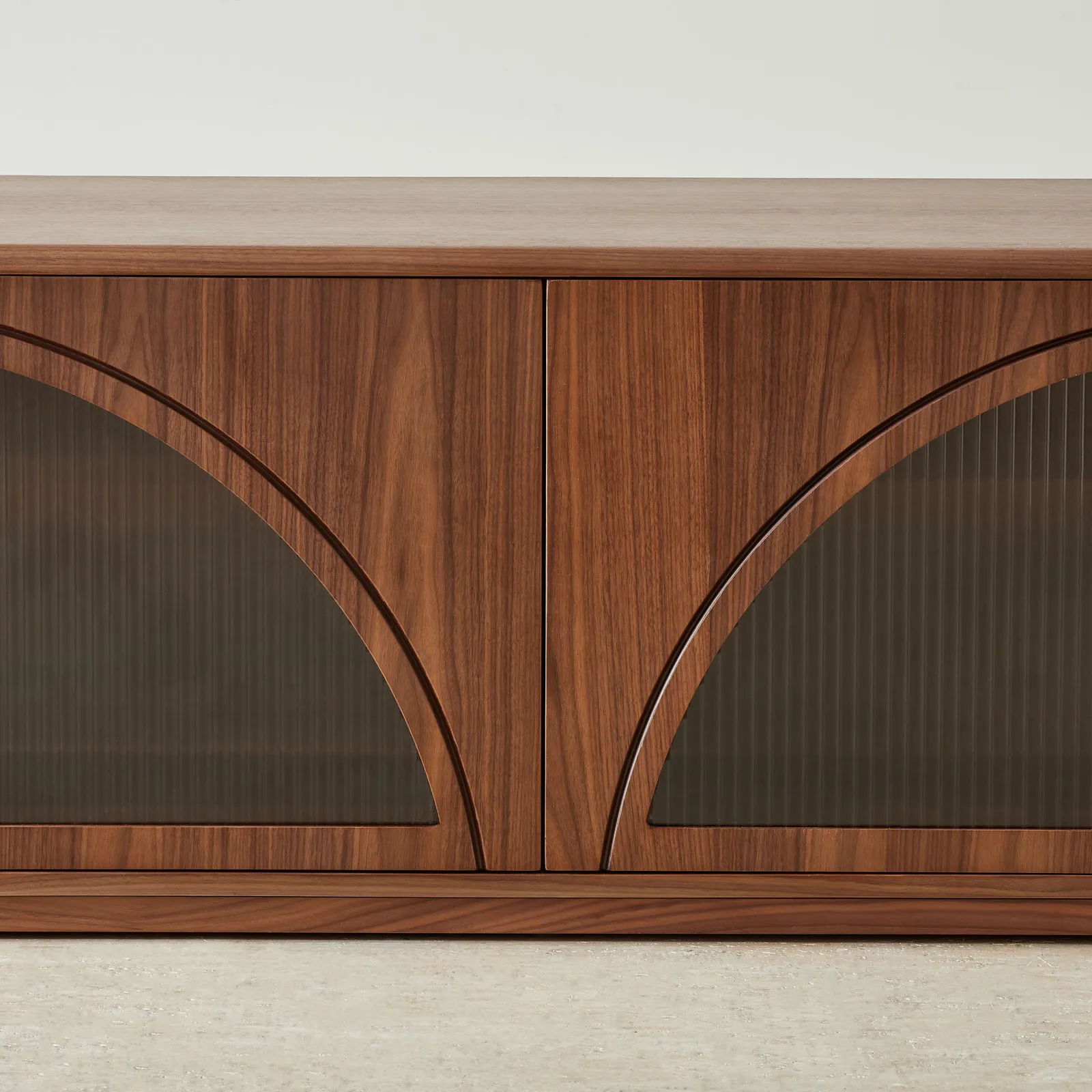 The Costanza Entertainment Unit blends streamlined form with subtle architectural detail. Its rich walnut brown finish frames four glass-front doors, each set with a distinctive semi-arch design that adds a modern twist to classic cabinetry.