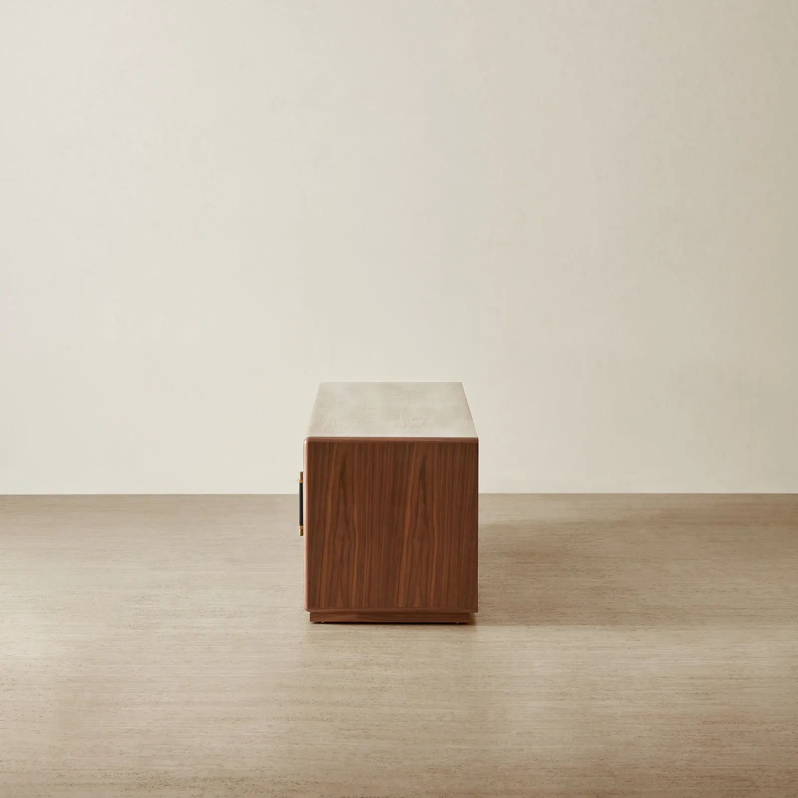 Sir Lionell Gliding White Sintered Stone Entertainment Unit - Walnut Brown Wooden Legs