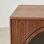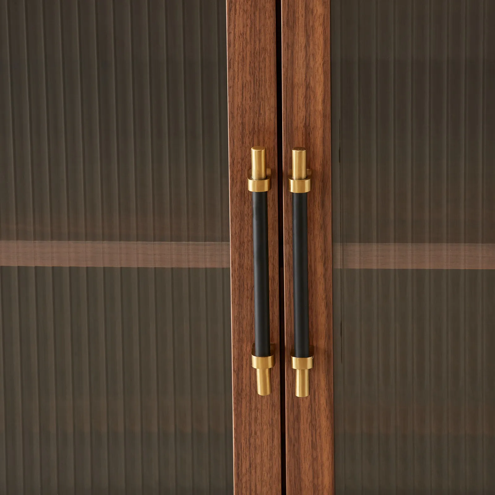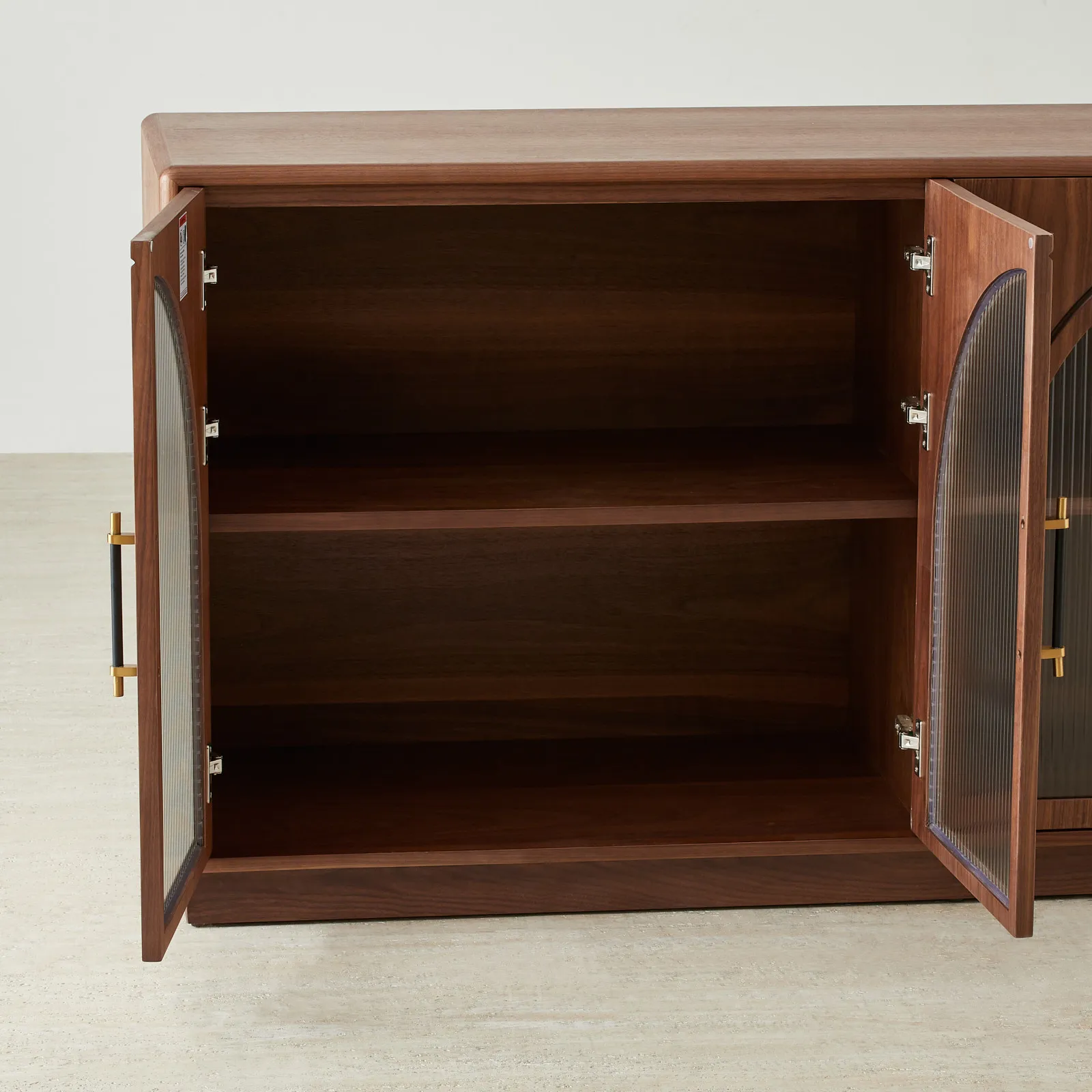 Four arched glass-front doors with ribbed panels reveal the contents inside, balancing function with a refined aesthetic. Finished in rich walnut brown and accented with brass-toned handles, it brings both utility and elegance to any setting.