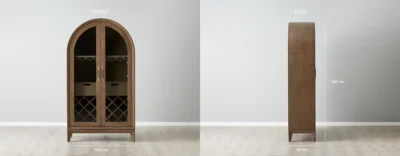 The Fredrik Brown Wooden Wine Display Cabinet stands as a testament to masterful craftsmanship and sophisticated design. Each piece of its rich, brown timber has been chosen for both beauty and durability, presenting a seamless blend of form and function. This elegance is further accentuated by its beautifully arched top, a balance between classic elegance and modern flair. The double glass paneled doors not only add an architectural touch but also serve as a window into the world of wines and spirits within, protecting while showcasing.