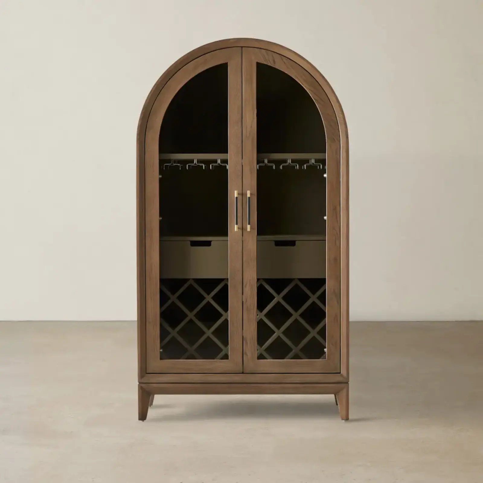 The Fredrik Brown Wooden Wine Display Cabinet stands as a testament to masterful craftsmanship and sophisticated design. Each piece of its rich, brown timber has been chosen for both beauty and durability, presenting a seamless blend of form and function. This elegance is further accentuated by its beautifully arched top, a balance between classic elegance and modern flair. The double glass paneled doors not only add an architectural touch but also serve as a window into the world of wines and spirits within, protecting while showcasing.
