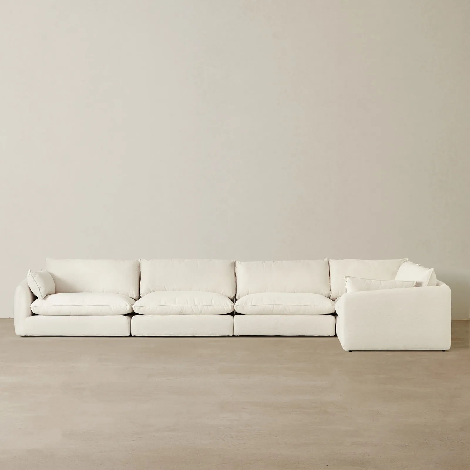 The Macie 5 Piece Modular Corner Sofa blends modern comfort with versatile design in a clean, cohesive form. Upholstered in chiffon white fabric, it introduces a soft, airy feel to your living space.