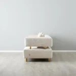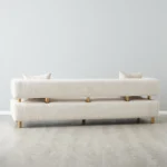 Chenille fabric is upholstered on its crafted wooden frame, offering a soft, textured feel. The sofa’s halves are separated by stainless steel columns in bright gold.