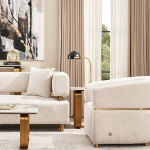 Experience cloud-like comfort with strategically placed foam and soft fabric in the Malta Chair, complemented by a gold-coloured stainless steel brace that elegantly separates its upper and lower sections. Four dark wooden legs provide sturdy support, and for a complete look, pair it with our Malta 3 Seater.