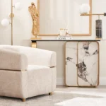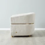 Experience cloud-like comfort with strategically placed foam and soft fabric in the Malta Chair, complemented by a gold-coloured stainless steel brace that elegantly separates its upper and lower sections. Four dark wooden legs provide sturdy support, and for a complete look, pair it with our Malta 3 Seater.