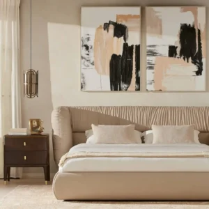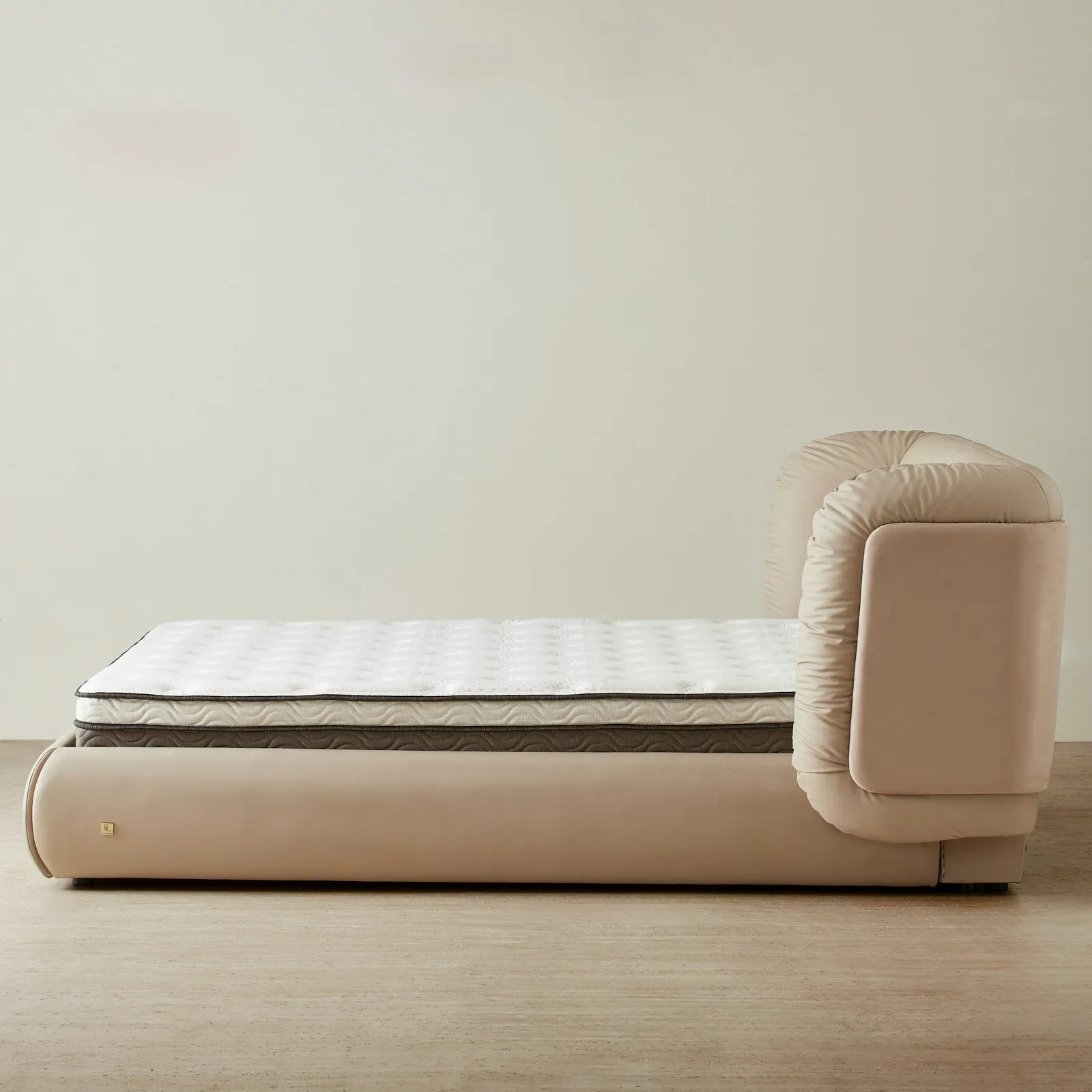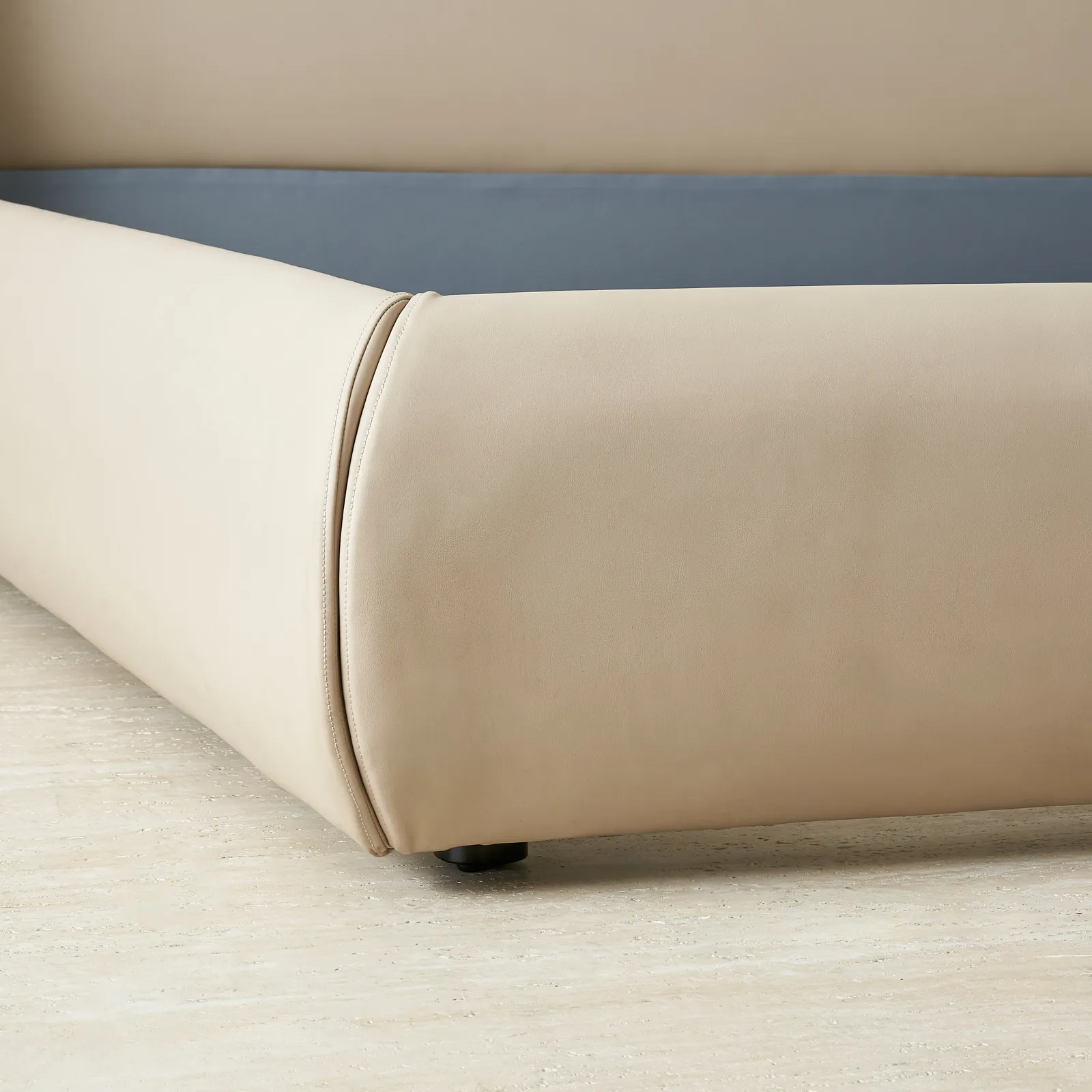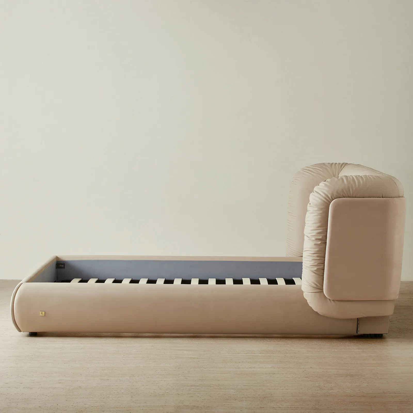 The Martina Bed makes a bold statement with its sculptural silhouette and unique texture. Wrapped in soft beige vegan leather, its gathered upholstery adds a sense of movement to the plush frame.