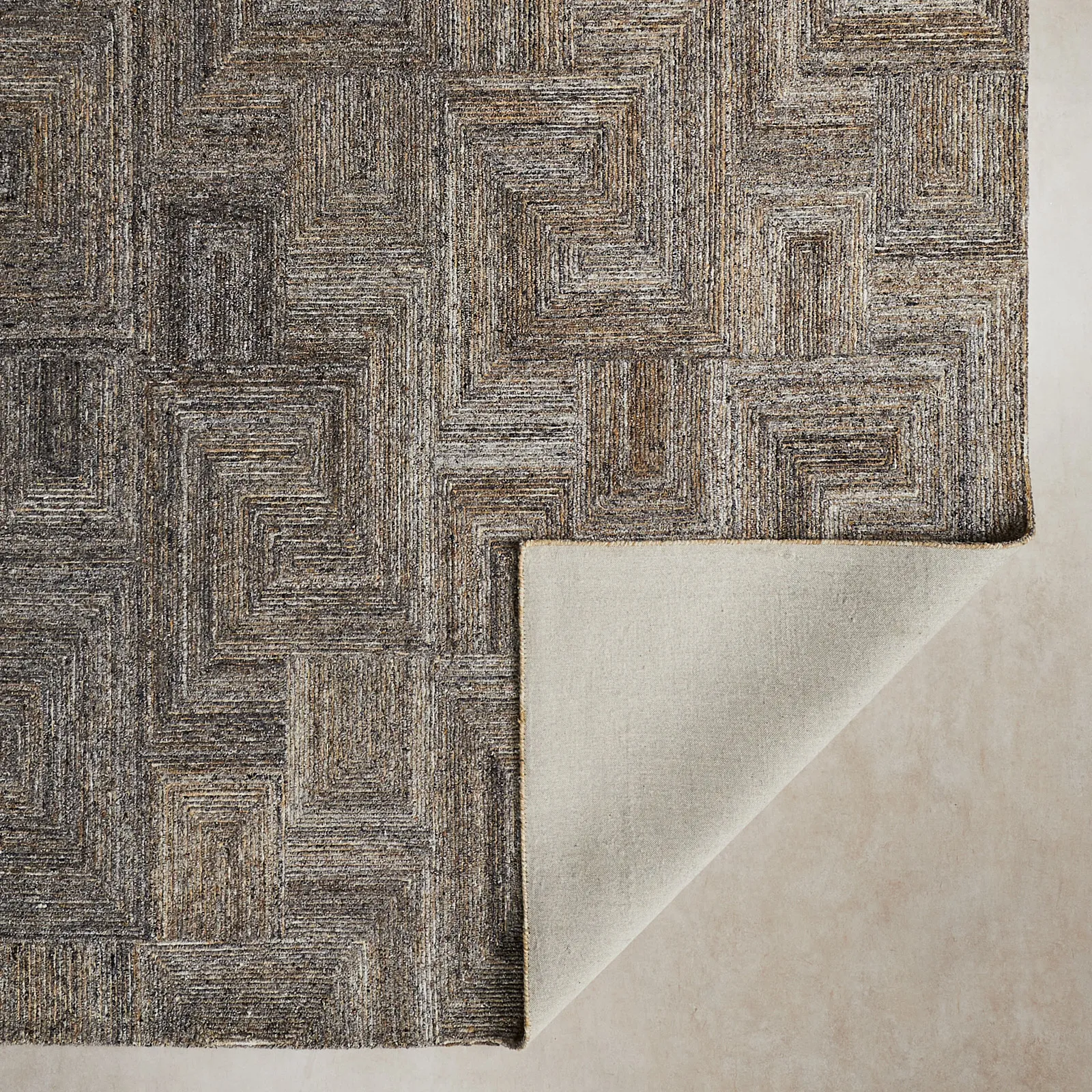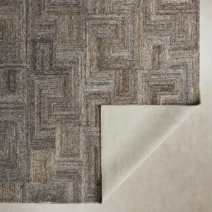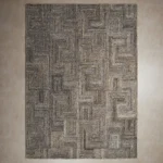 The Messina Sponge Floor Rug features a captivating geometric design with interlocking squares and rectangles, adding depth and texture.