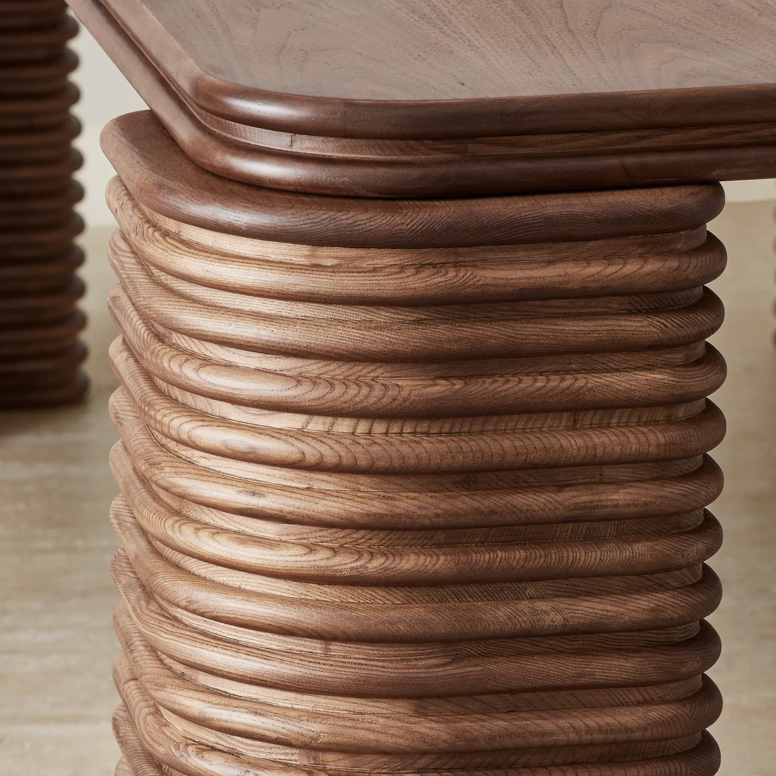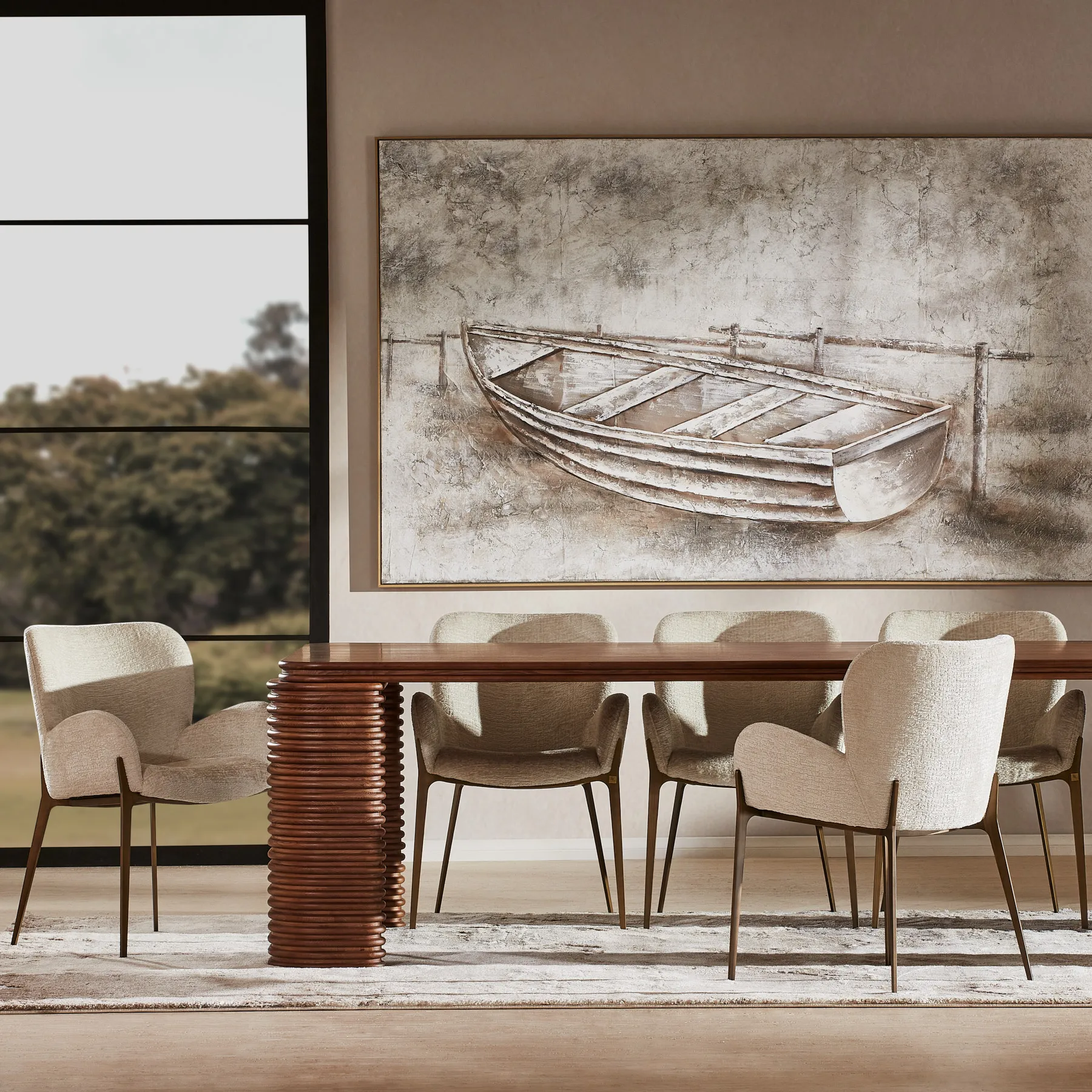 Intricately carved legs showcase a sophisticated stacking pattern, emphasizing detailed craftsmanship. Comfortably seating 8 to 10 guests, the Ophelia provides ample space for gatherings.