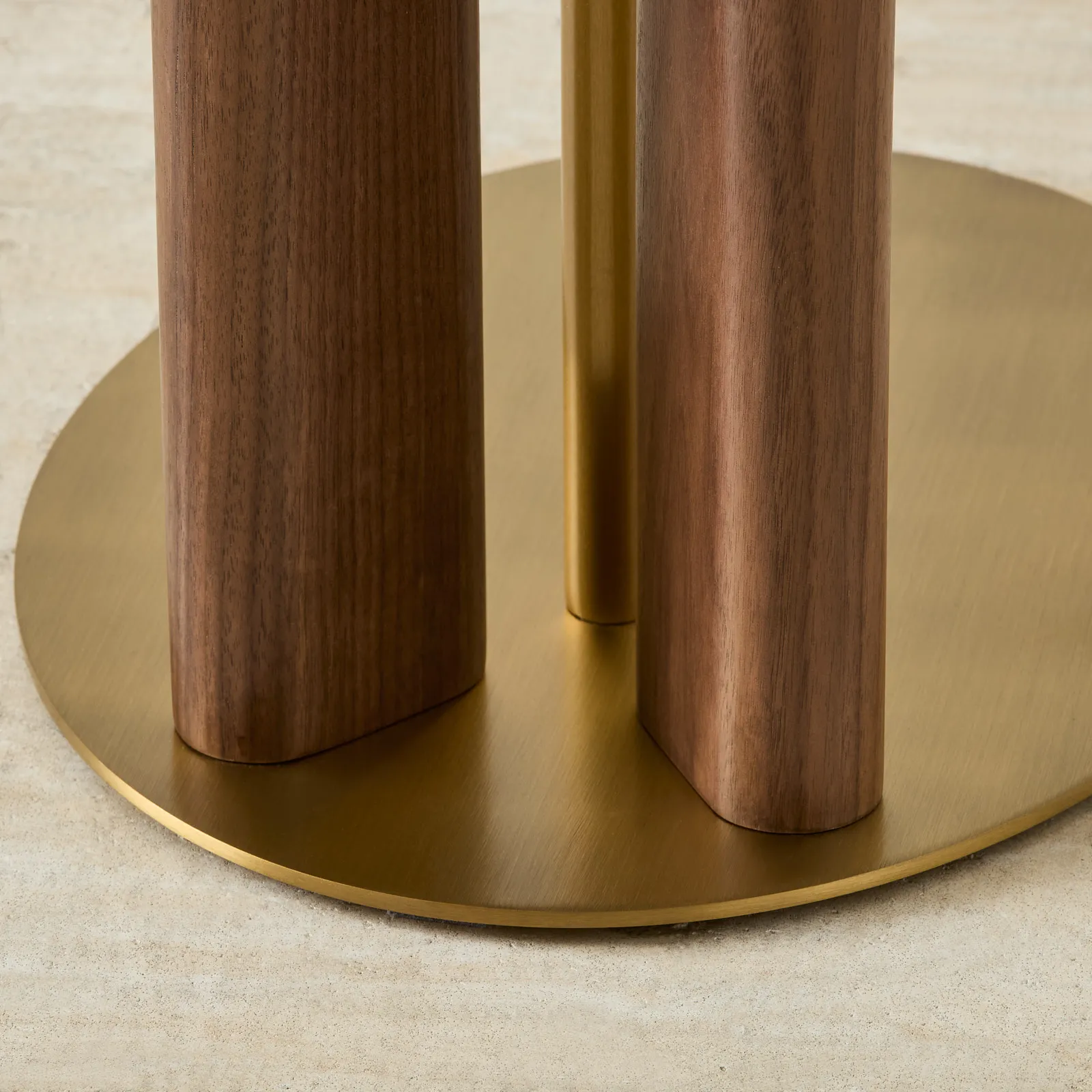 The Sir Lionell Gliding Side Table features a round white sintered stone top with gentle veining, set upon walnut brown wooden legs. The table’s design incorporates open spaces between the legs, creating a refined balance of form and function.
