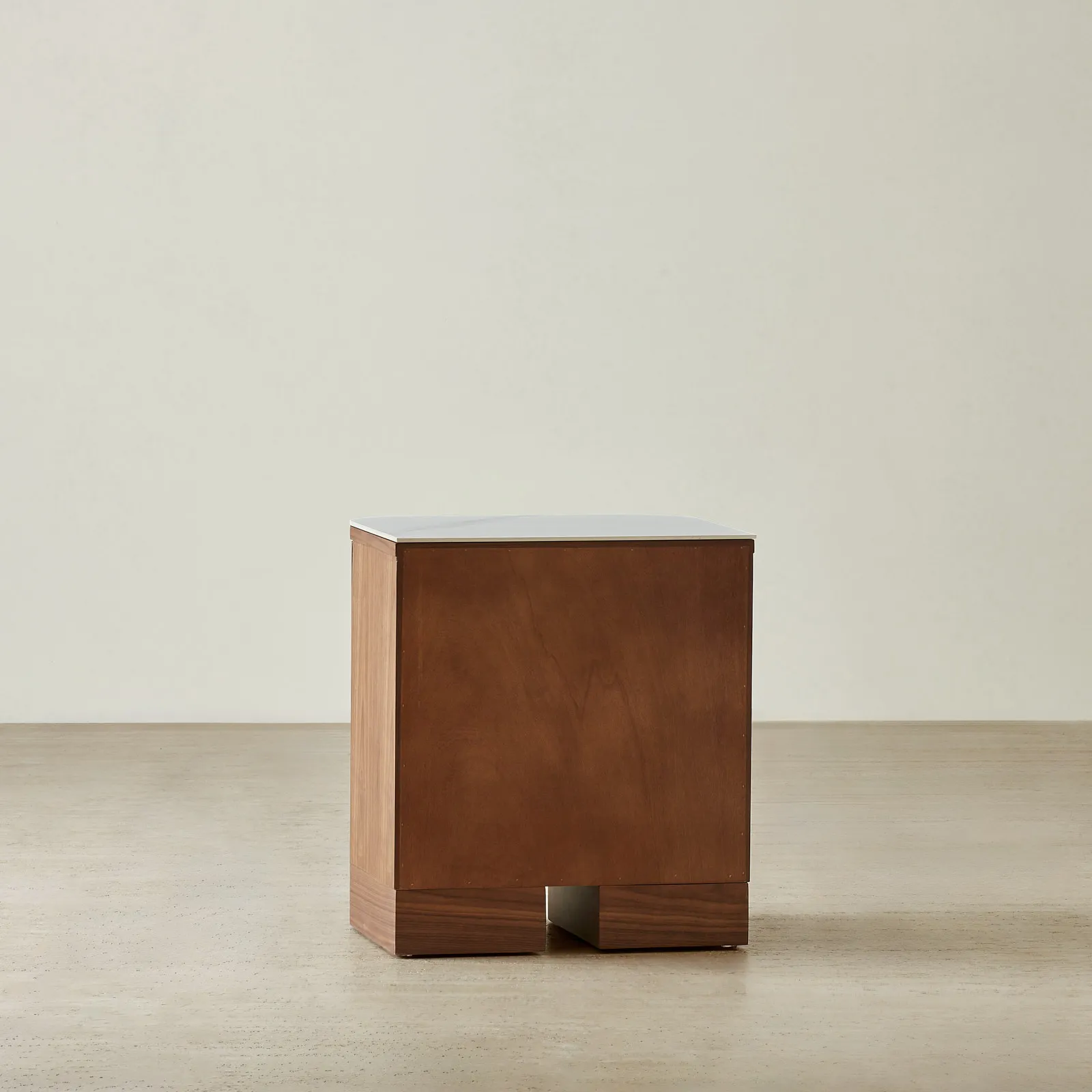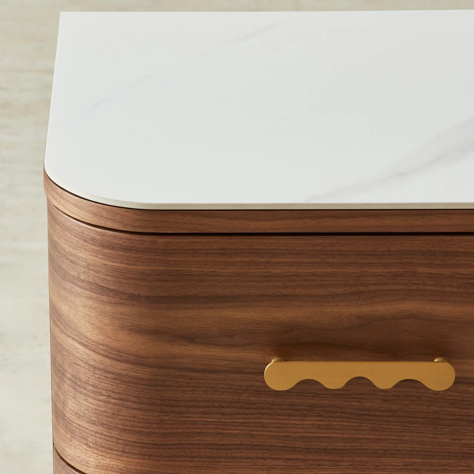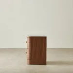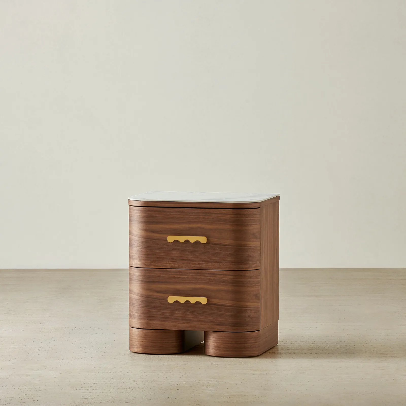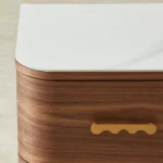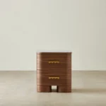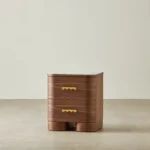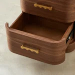 The Terzetto Kids Bedside Table brings warmth and playfulness to a child’s room. A place for books, bedtime treasures, and those small things that make the night feel cosy. Its rich mocha walnut finish pairs with a smooth white top, while whimsical wave-shaped brass handles add a cheerful touch to its rounded form.